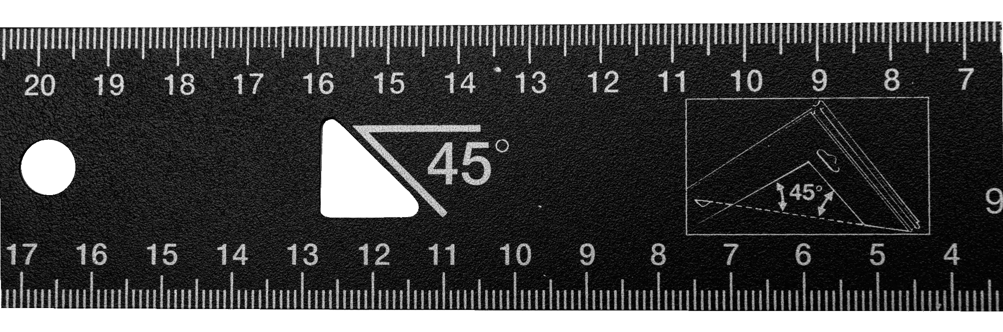 - Kątownik ze stali kutej, daje możliwość precyzyjnego mierzenia i odmierzania kątów 90° i 45°.