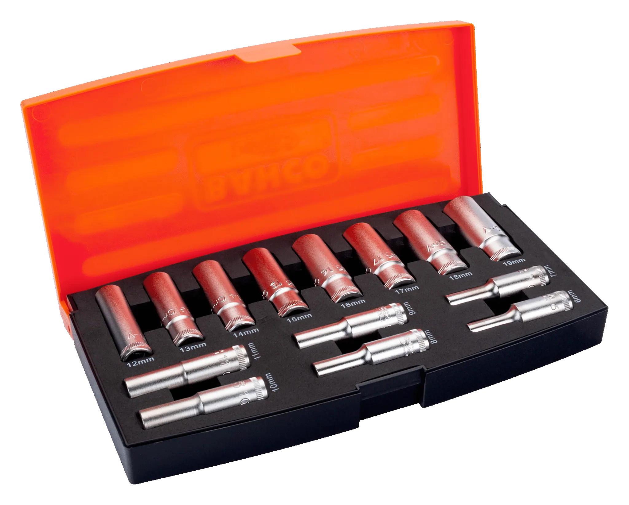 - Zawartość: 14 szt. nasadek w rozmiarach: 6, 7, 8, 9, 10, 11, 12, 13, 14, 15, 16, 17, 18, 19 mm